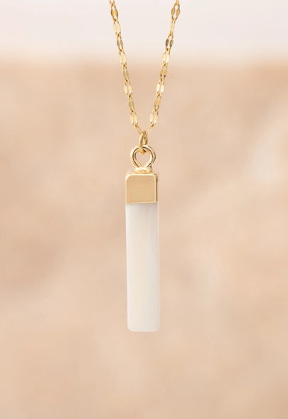 The Brayden Pendant in mother of pearl, is pure elegance made for daily wear! Each iridescent mother of pearl pillar is wrapped in sleek 14k plated gold on an adjustable chain. Wear this timeless necklace daily wear or layer with other fair-trade favorites.